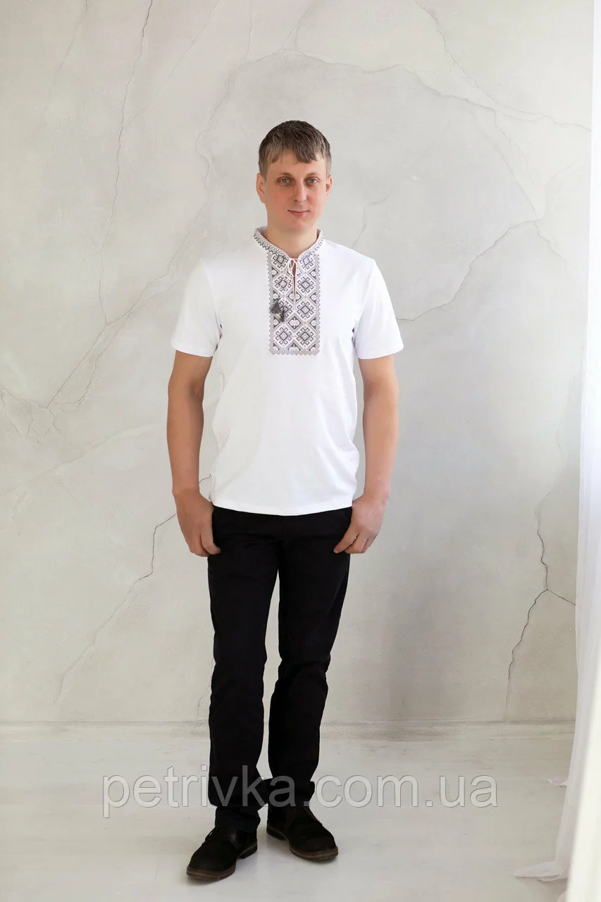 Біла футболка з коротким рукавом, машинна вишивка хрестиком комірець стійка, висока якість пошиття!