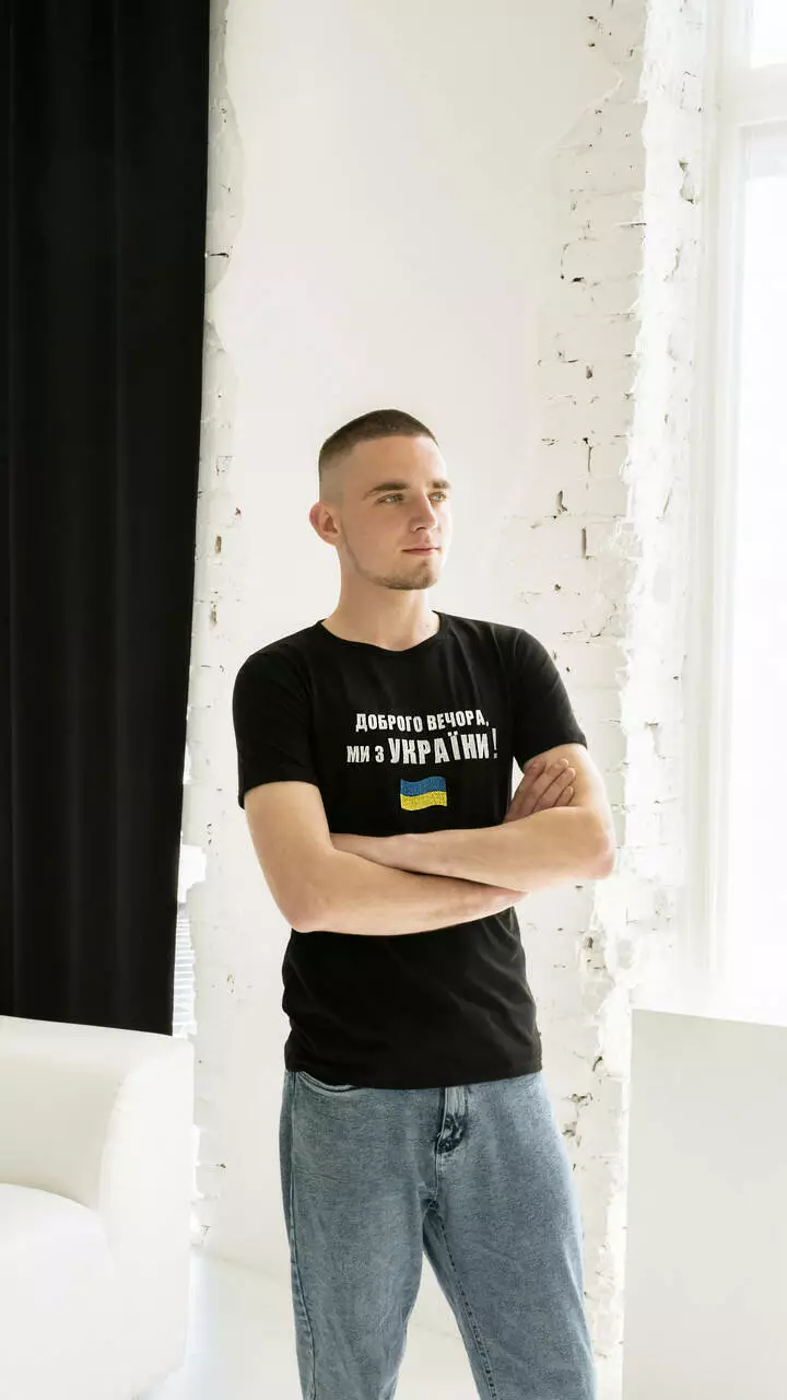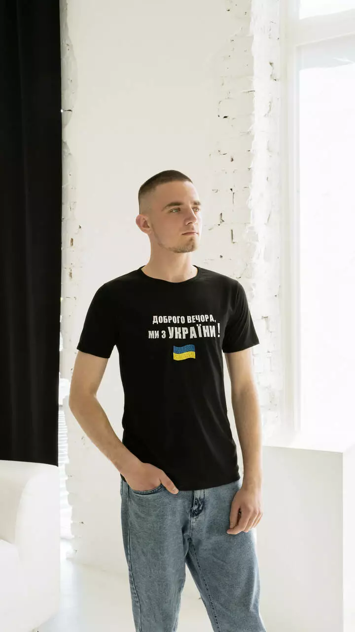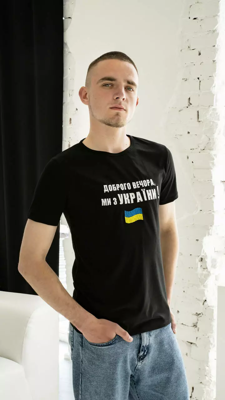 Чоловіча Патріотична футболка з вишитим надписом "Доброго вечора, ми з України" М-02