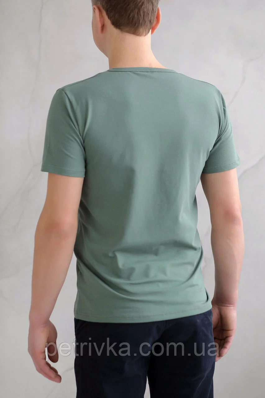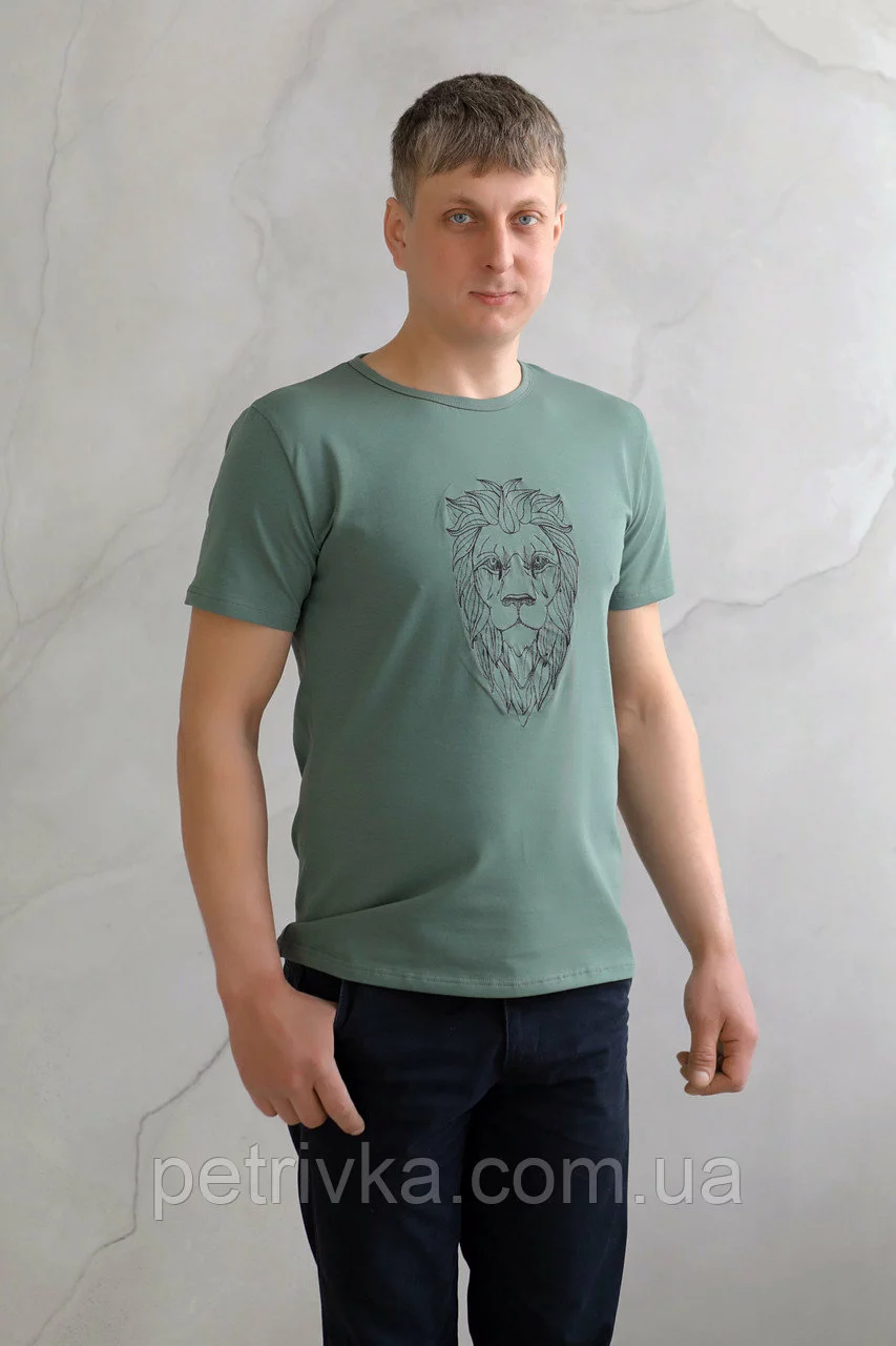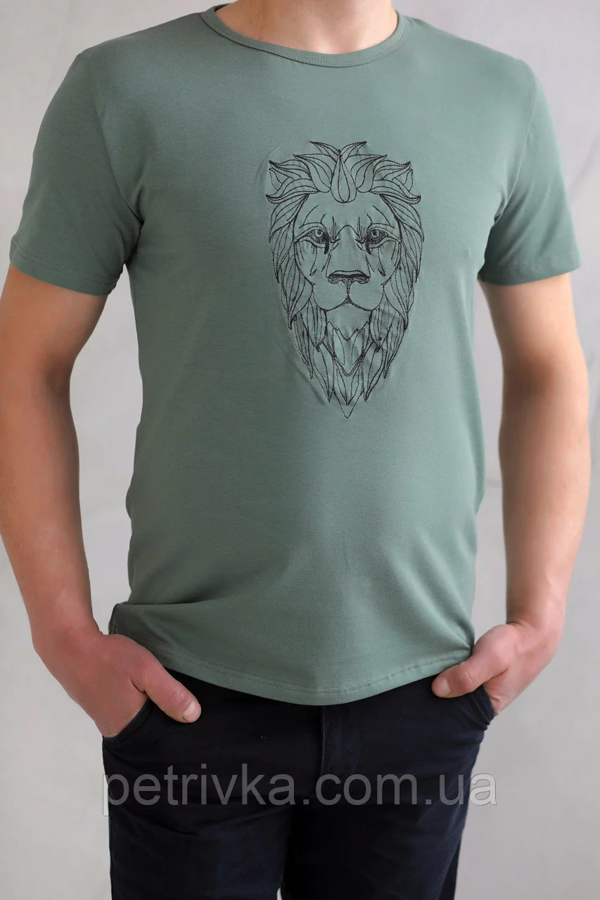 Чоловіча футболка зелена з вишитим принтом Лев, висока якість,