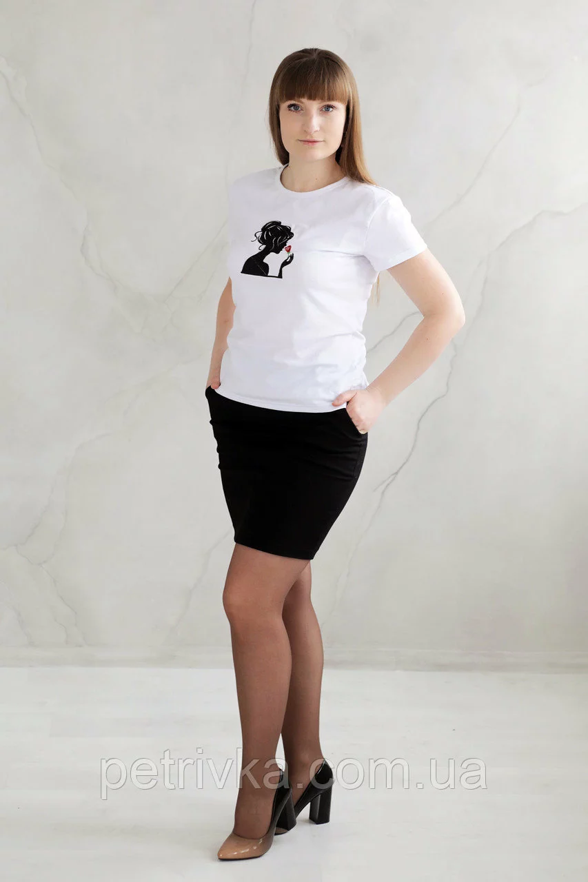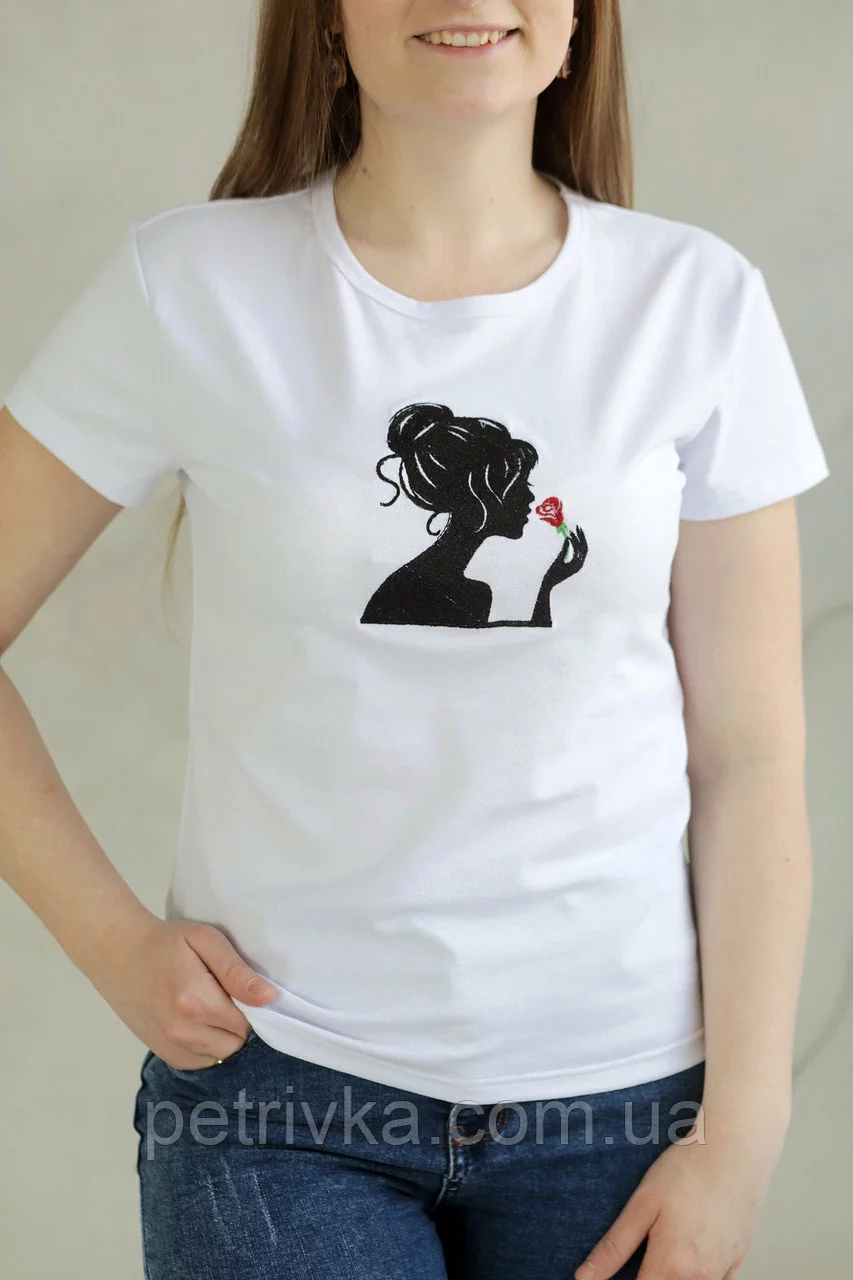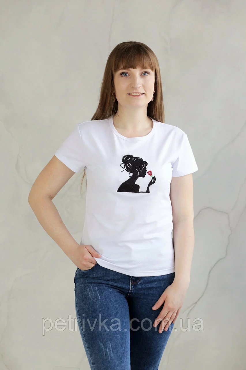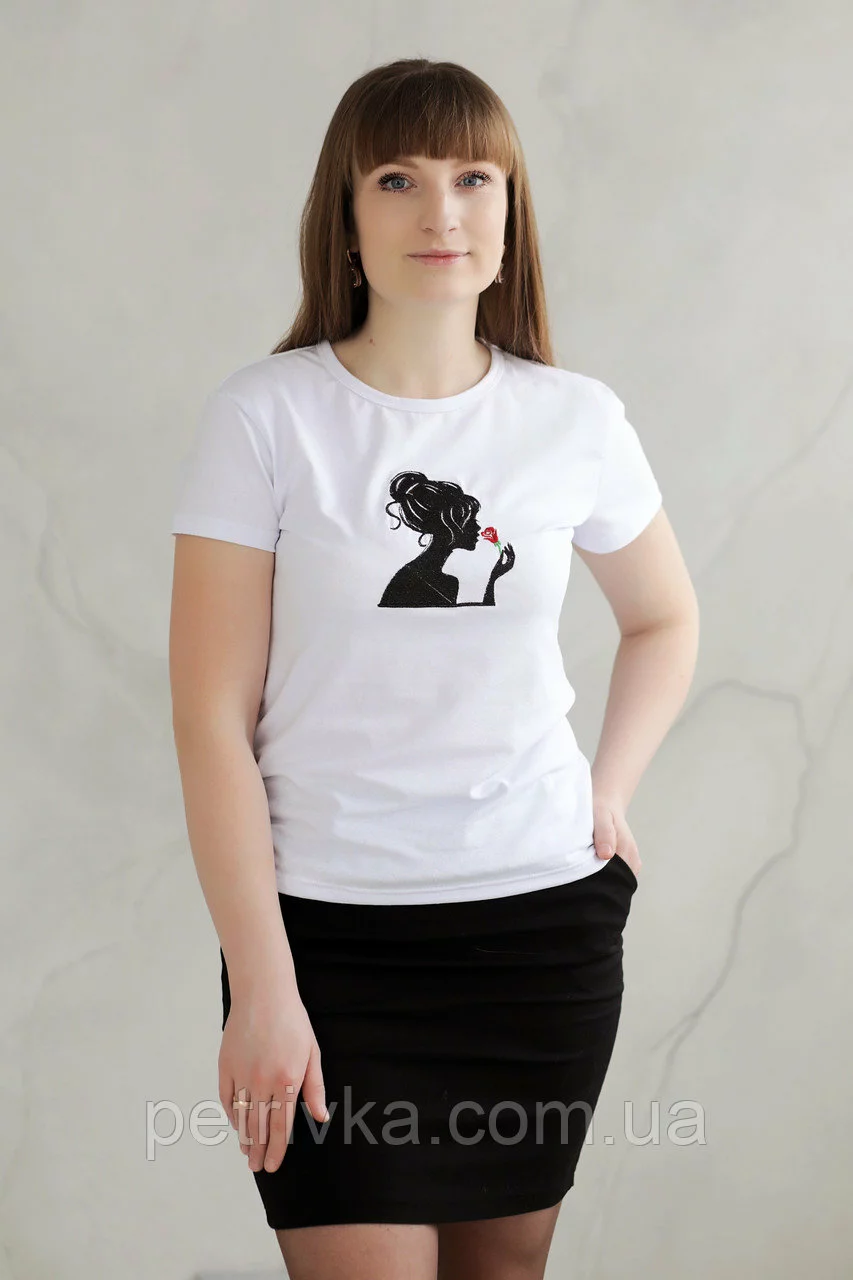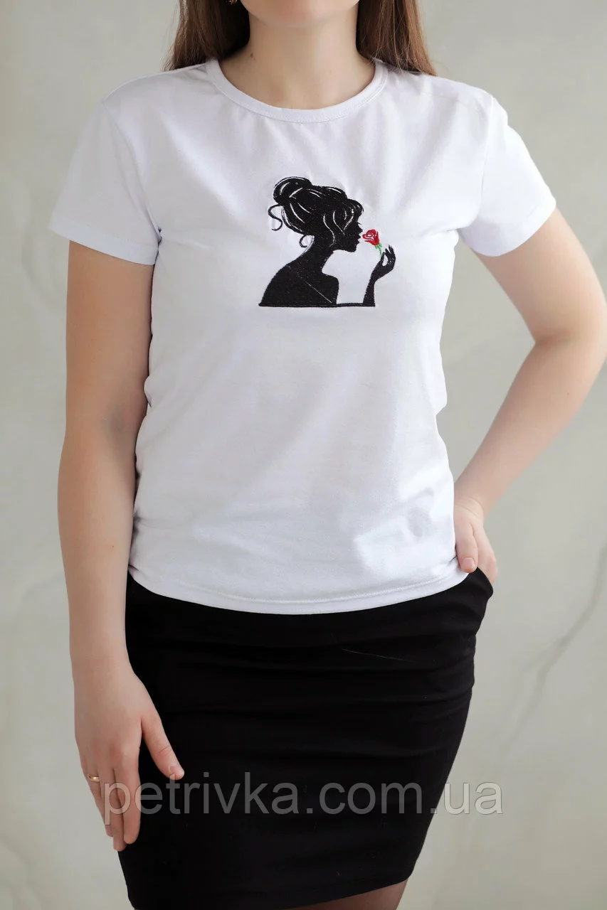 Жіноча біла футболка в стилі CASUAL, з вишитим принтом "Жіноча
