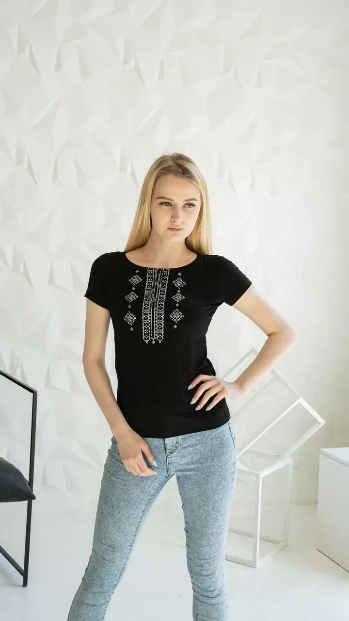 Дивовижна вишита жіноча футболка з вишитими сірими нитками узором