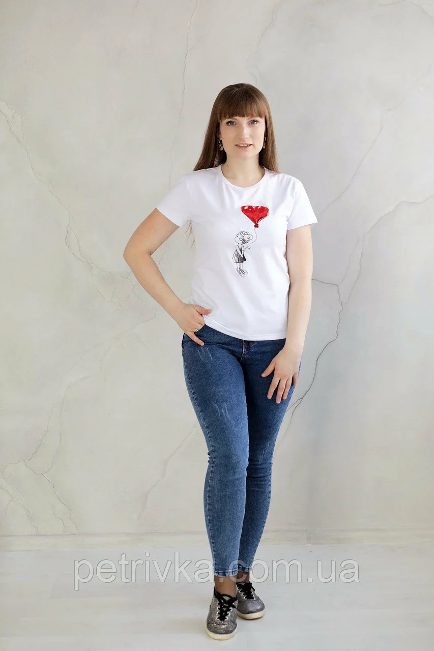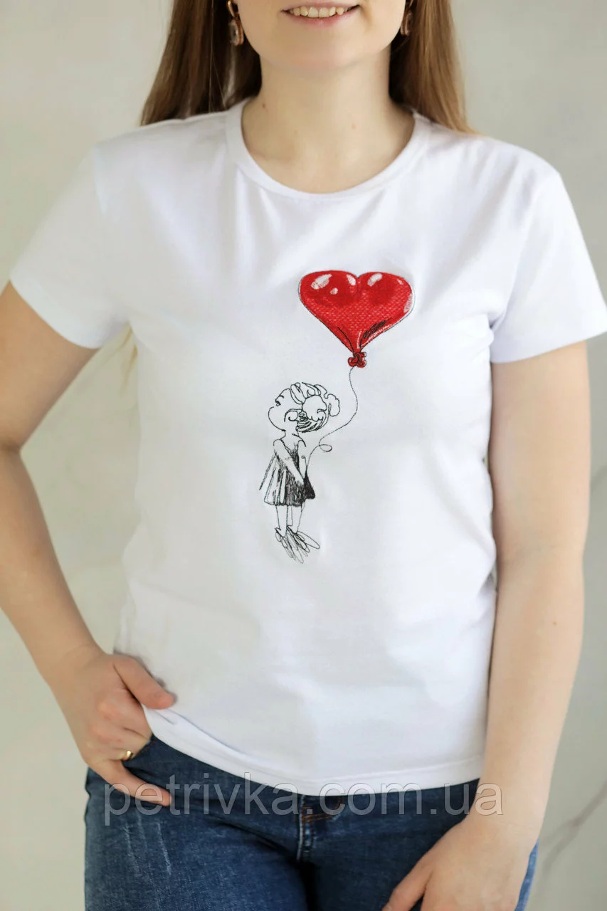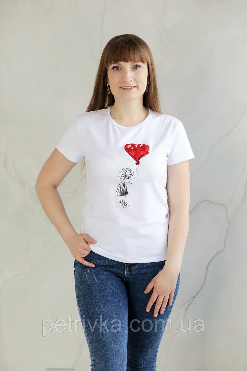 Футболка жіноча в стилі Casual з принтом Дівчинки з кулькою серцем