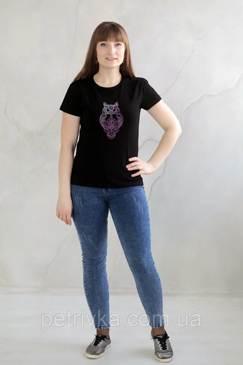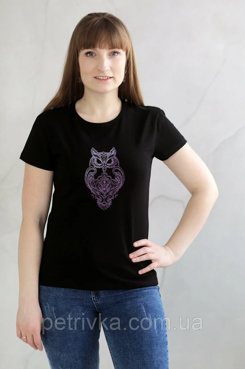 Жіноча чорна футболка в стилі CASUAL, з вишитим принтом Сова