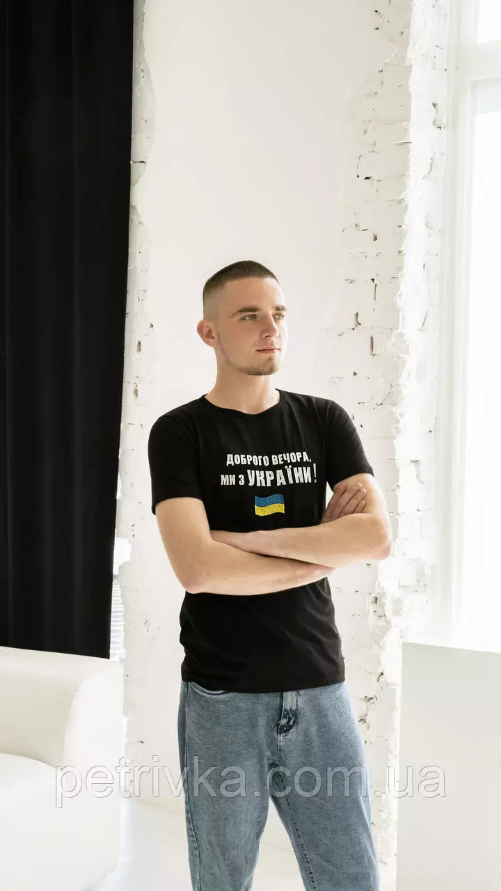 Мужская Патриотическая футболка с вышитой надписью "Добрый вечер, мы из Украины" М-02