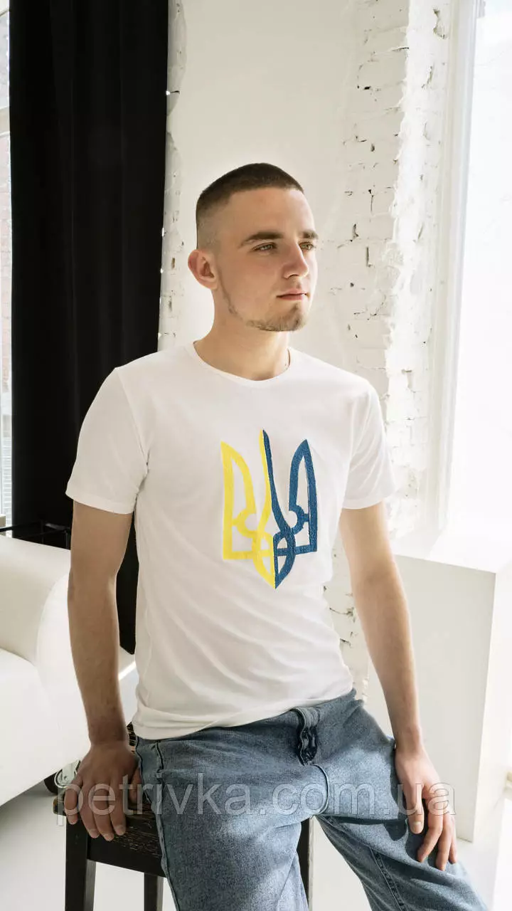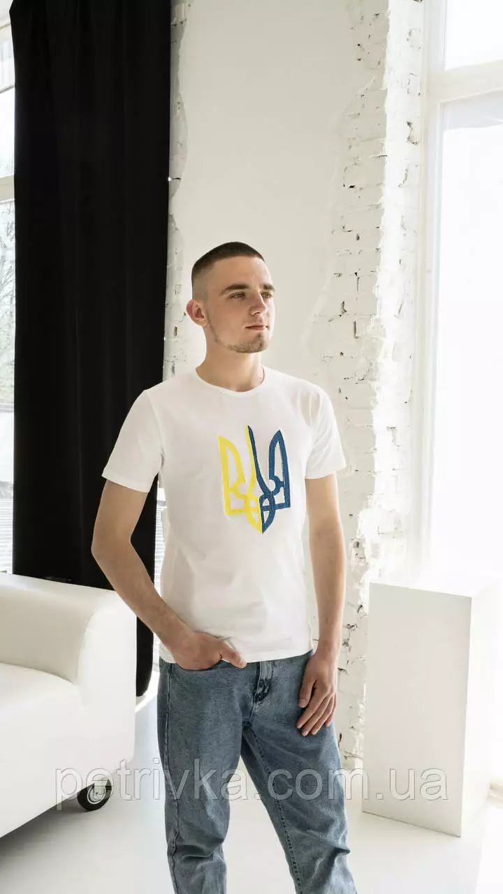 Патриотическая мужская футболка на белой ткани "Тризуб" М-01