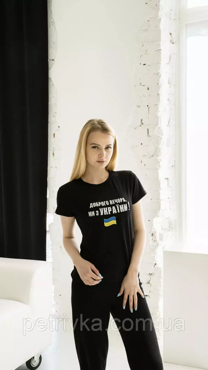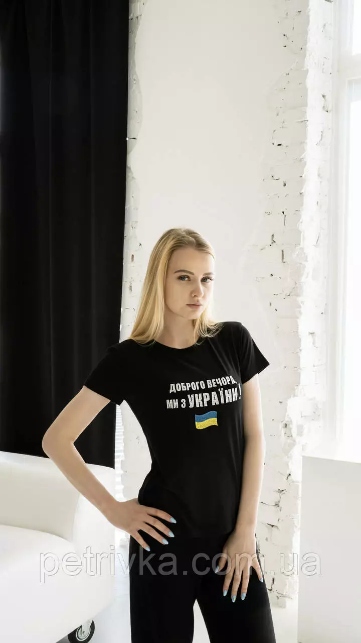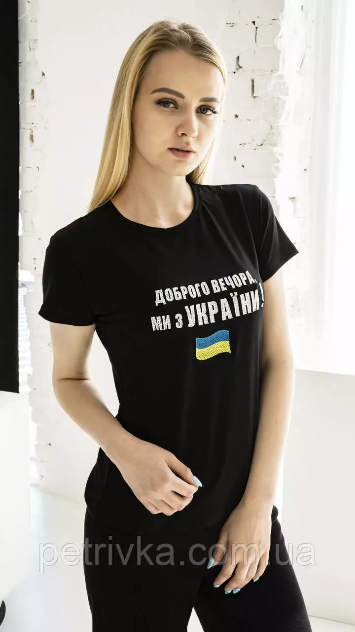 Патриотическая женская футболка "Добрый вечер, мы из Украины", на черной ткани Н-03