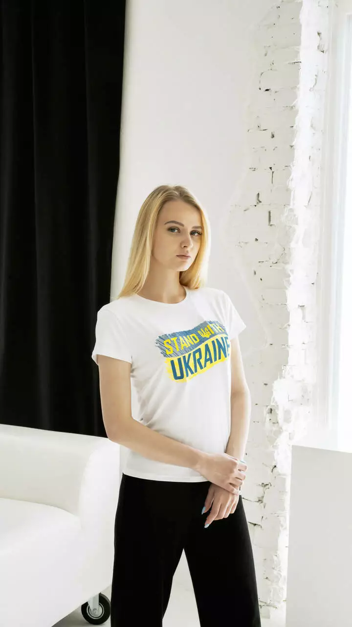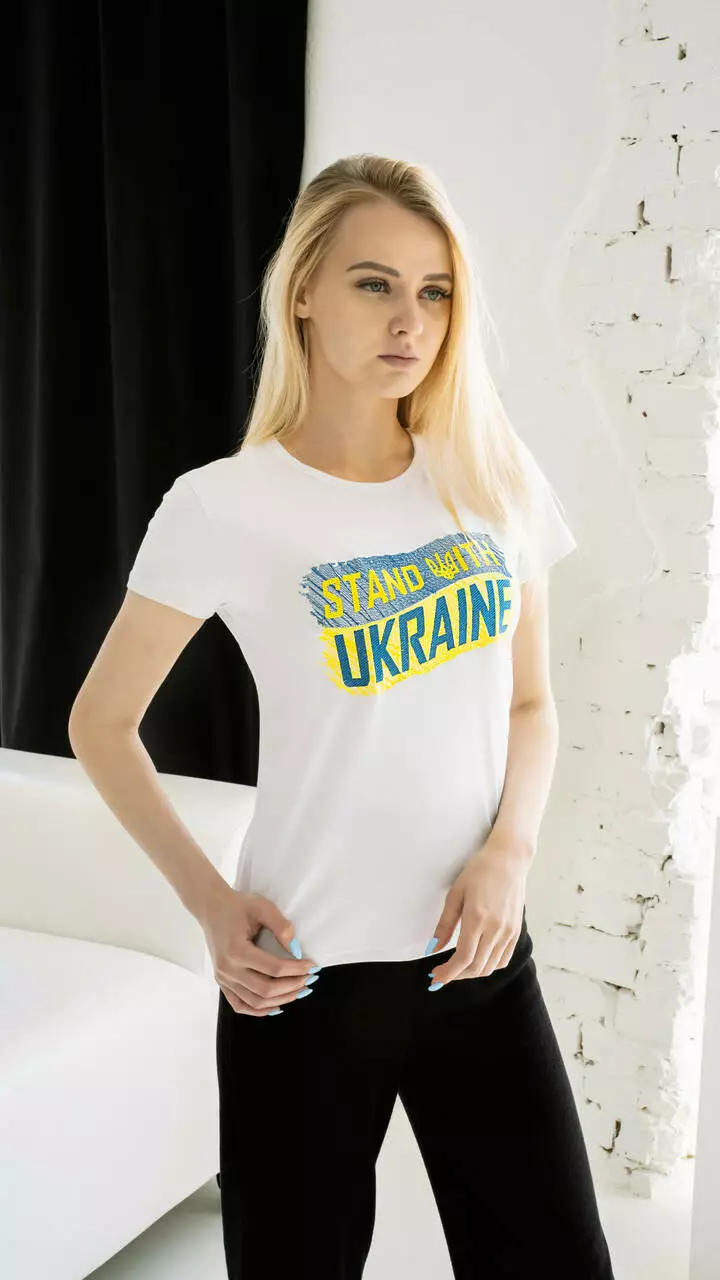 Патріотична жіноча футболка з вишитим надписом "Стою з Україною" на білій тканині Н-01