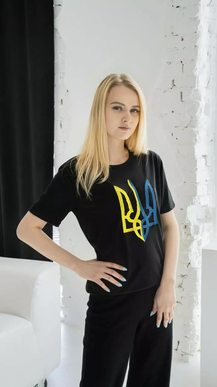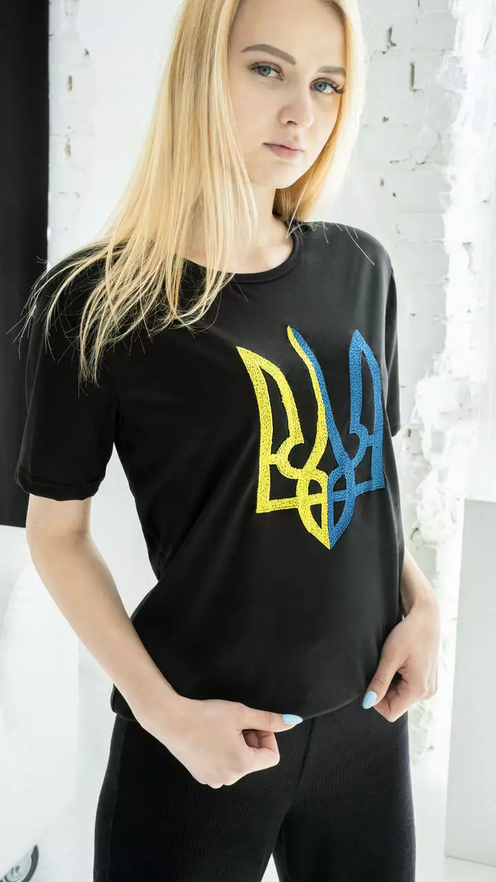 Прекрасна Патріотична футболка з вишитим Тризубом, на чорній