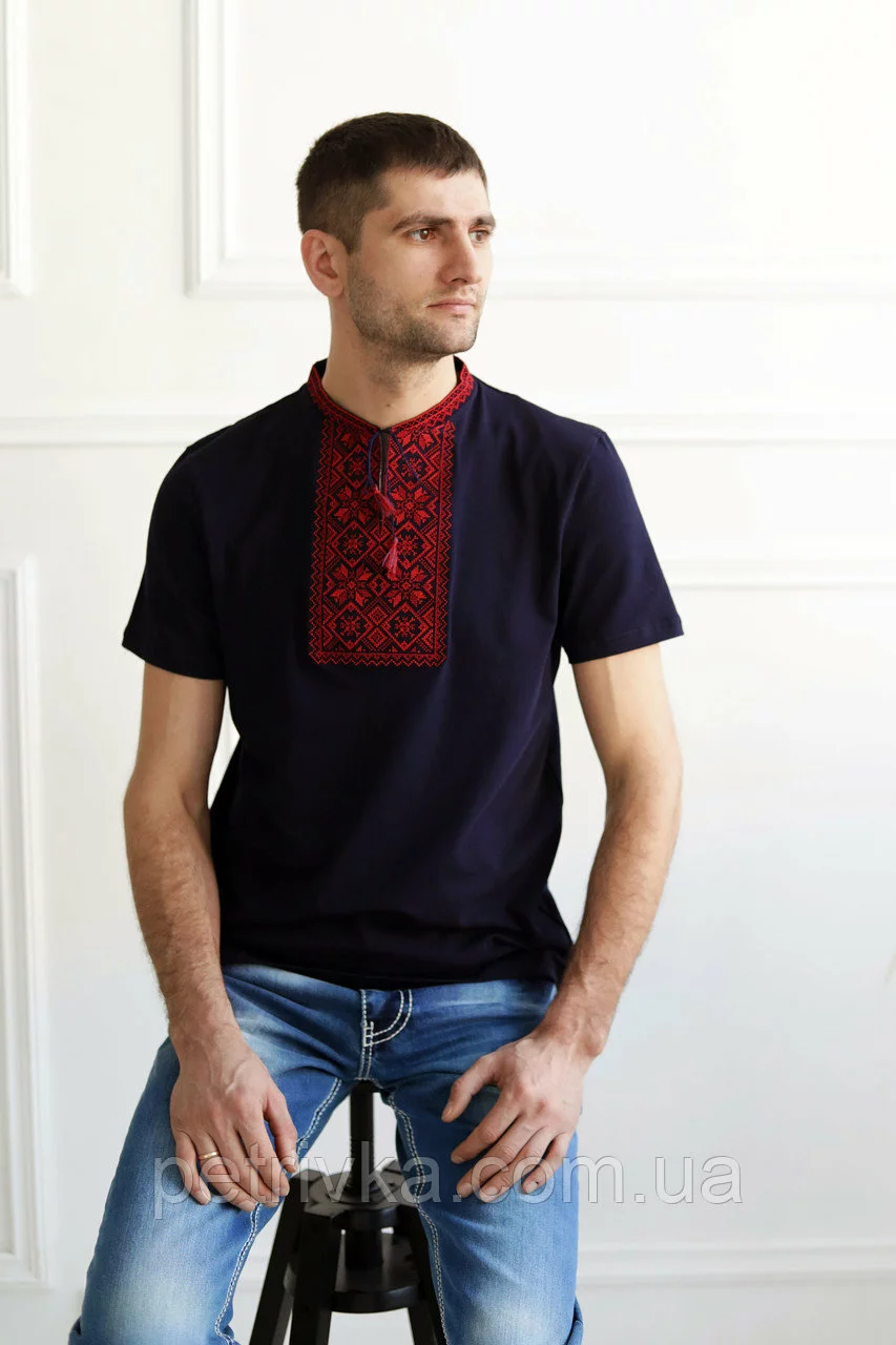 Сучасна вишита чоловіча футболка з вишивкою на синій тканині
