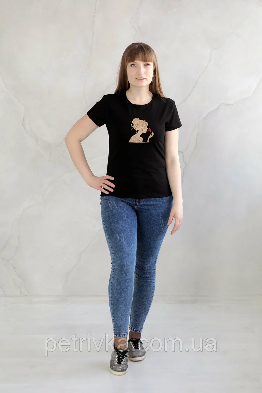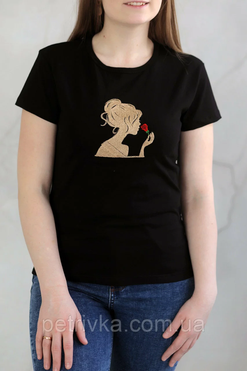 Жіноча чорна футболка в стилі CASUAL, з вишитим принтом "Жіноча