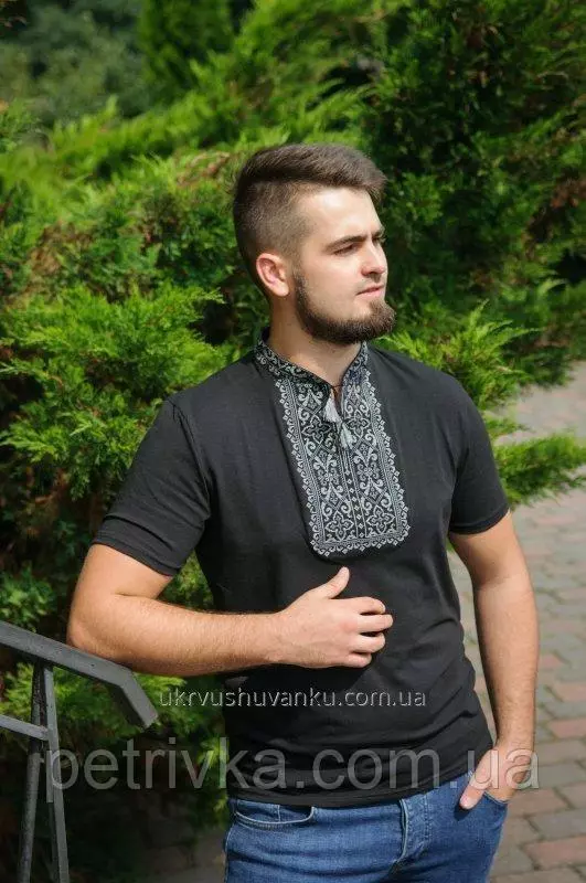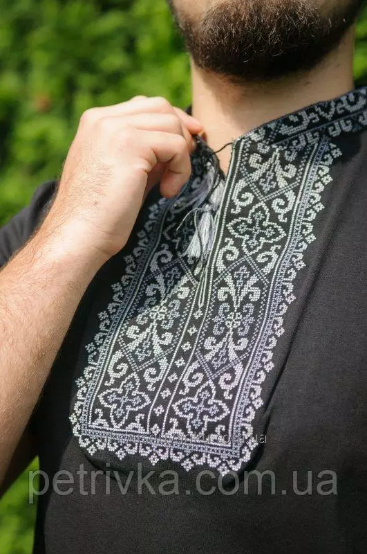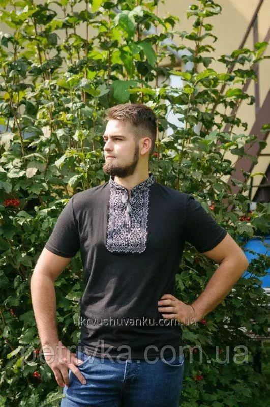 Чудова чорна вишита чоловіча футболка, вишитими сірими нитками узори