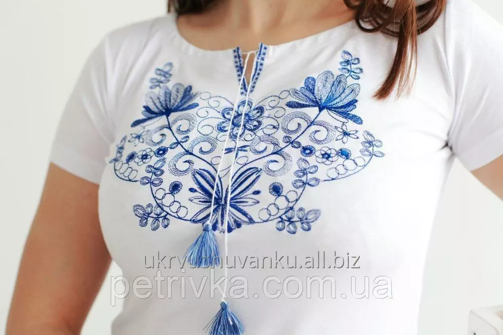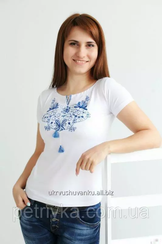 Молодіжна вишита жіноча футболка вишита синіми нитками Весна А-19