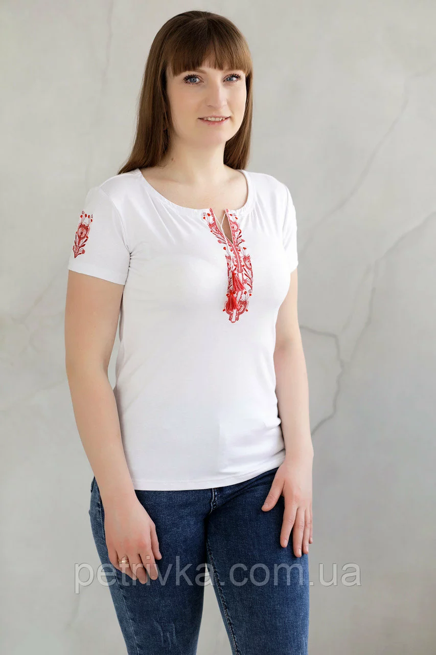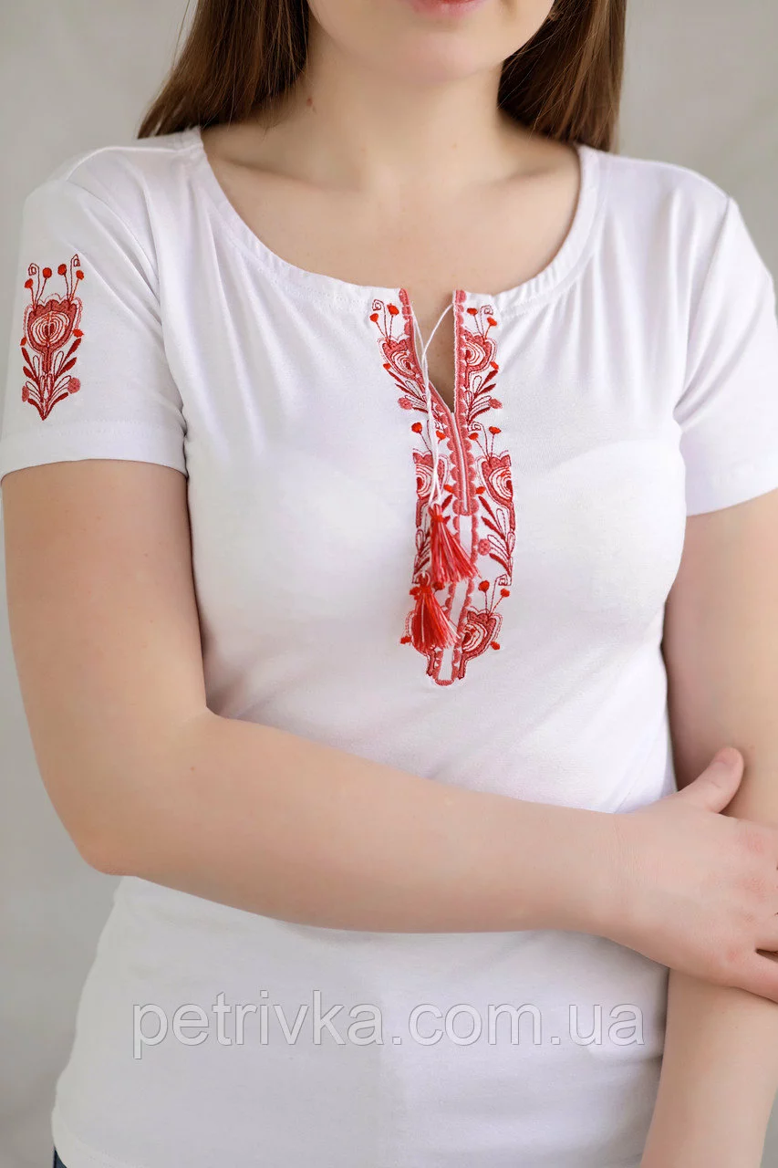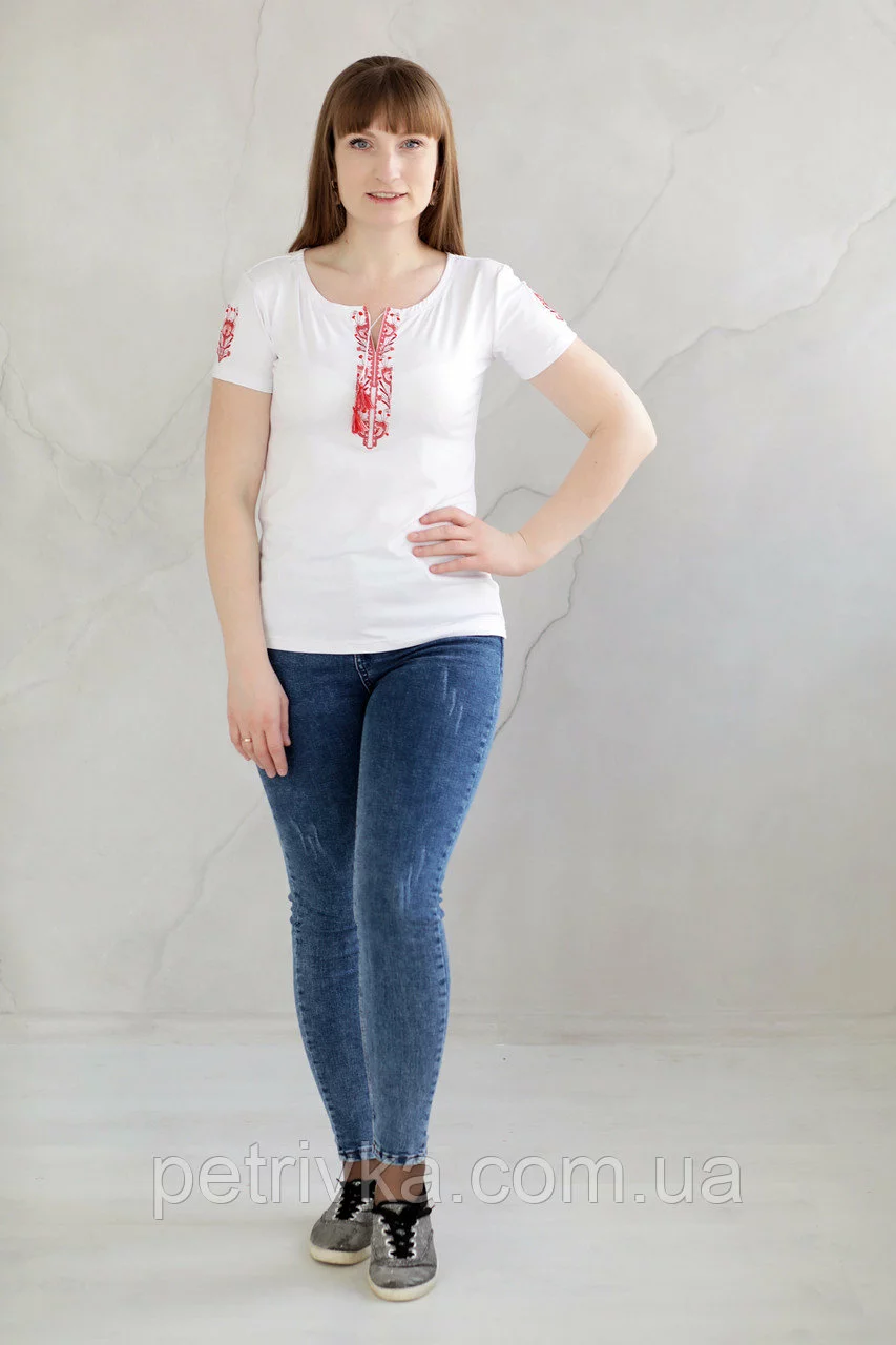 Дивовижна жіноча футболка з вишитими рукавами