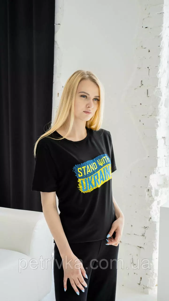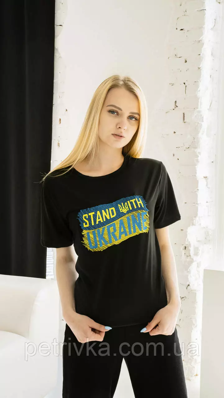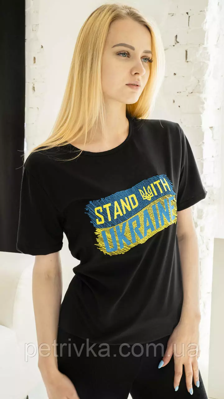 Женская патриотическая футболка с вышитым Флагом Украины на черной